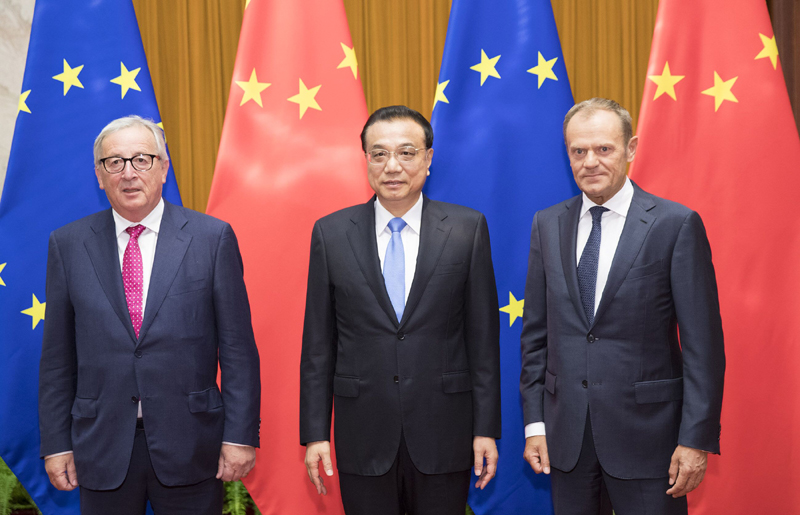 李克强与欧洲理事会主席图斯克、欧盟委员会主席容克共同主持第二十次中国欧盟领导人会晤