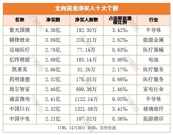 个股方面,北向资金净买入紫光国微(002049.SZ)、赣锋锂业(002460.SZ)、迈瑞医疗(300760.SZ)、亿纬锂能(300014.SZ)、凯莱英(002821.SZ)居前。