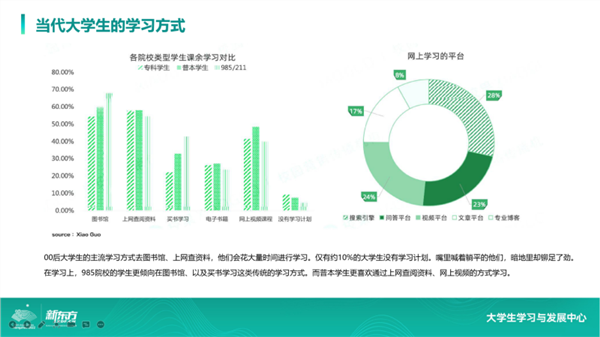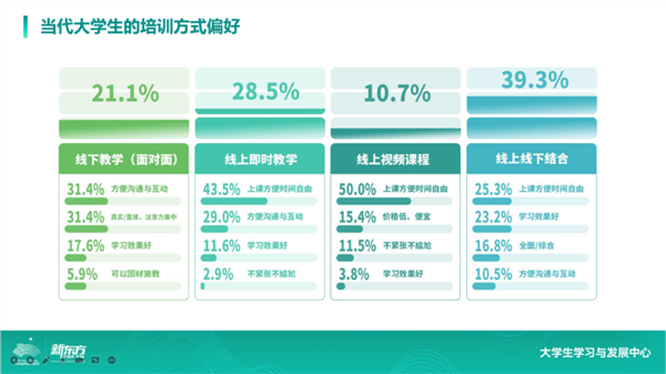 第一个是产品矩阵,我们发现大学生的学习需求林林总总有很多,除掉一些受众群体少的品类,像财会培训,甚至包括公务员考试等,都是大学生非常热衷参加的学习项目。基于此,新东方把品类进行了相应的扩展,有的是通过纯线上的形式,有一些现在已经变成了线上+线下的形式,这样有利于我们交给学生们更好的产品和相关的服务。