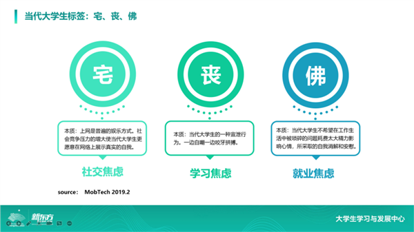 我们在研究报告里看到的“宅”、“丧”、“佛”几个标签,分别对应了当代大学生的社交焦虑、学习焦虑、就业焦虑。