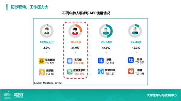 此外,求职的压力也体现在大学生使用最高频的APP当中。相关数据显示,在18-24岁之间的大学生中,使用求职类APP的频率比我们想象得要高很多,也就是说一边读书一边已经在考虑未来的求职,甚至在大学期间就开始兼职的人不在少数。