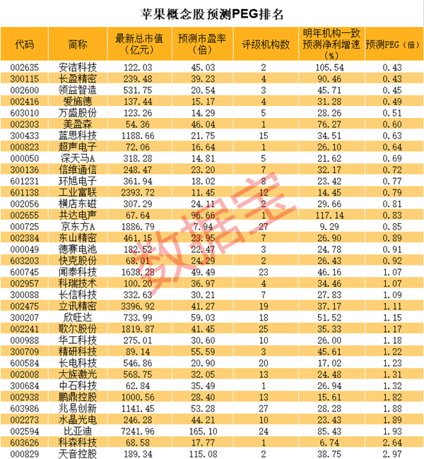 不论苹果有什么消息或者是动作,对A股苹果产业链都会产生刺激作用。目前A股市场上苹果概念股总市值接近3万亿元。证券时报·数据宝统计,从机构预测市盈率和机构预测明年净利增速来看,安洁科技、长盈精密、领益智造、爱施德等个股预测PEG均低于1倍。(数据宝 陈见南)