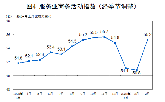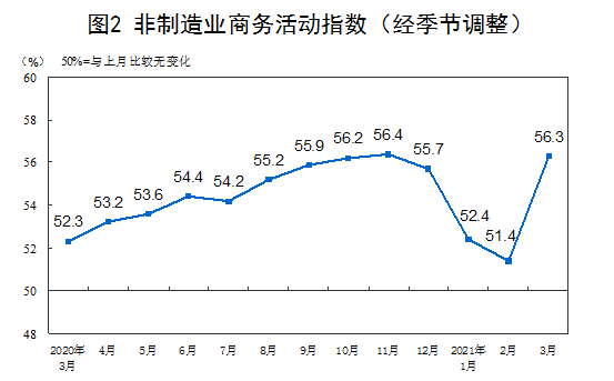 3月份,非制造业商务活动指数为56.3%,较上月上升4.9个百分点,表明非制造业扩张有所加快。