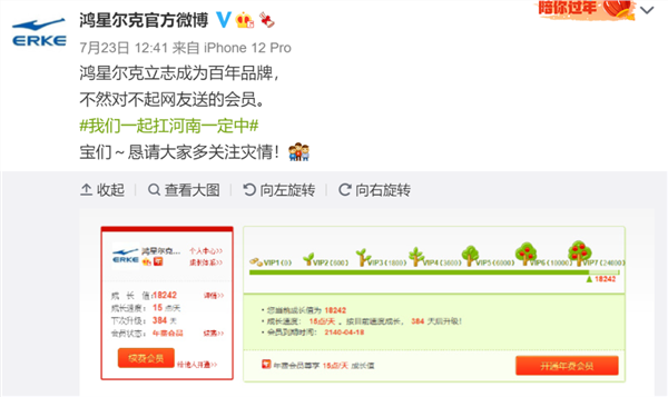 对此,鸿星尔克回应称,鸿星尔克立志成为百年品牌,不然对不起网友送的会员。