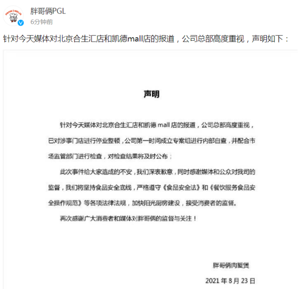 8月23日中午胖哥俩回应称两家涉事门店已停业整顿,公司成立专案组进行内部自查,并配合市场监管部门进行检查。
