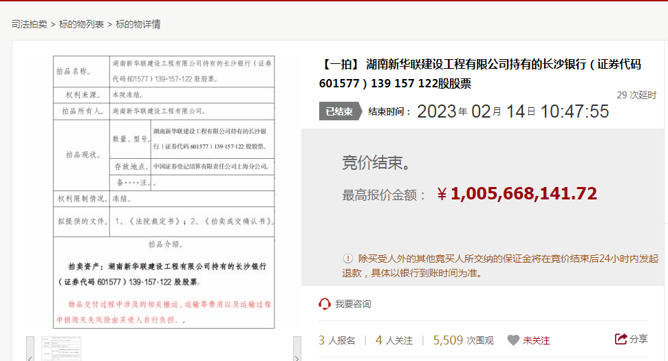 北京产权交易所信息显示,新华联建设持有的长沙银行约1.39亿股股份在该平台结束拍卖,经过32轮竞价,长投控股给出了10.06亿元的高价,并摘得该笔股权,最终成交价较起拍价上浮约16.2%。