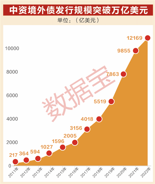 2015年是中资境外债发展的关键时点,发行1年以上债务工具由以前的审批制度改为事前备案制。自2016年起“功夫债”发行量大幅提升,今年2月份,中资境外债存量余额首次突破万亿美元。截至2022年9月底,中资境外债余额创历史新高,达到1.22万亿美元,为十年前的32倍。金融机构、房地产、工业、可选消费等行业企业是主要发行主体,其中金融机构发行量占比超过32%。